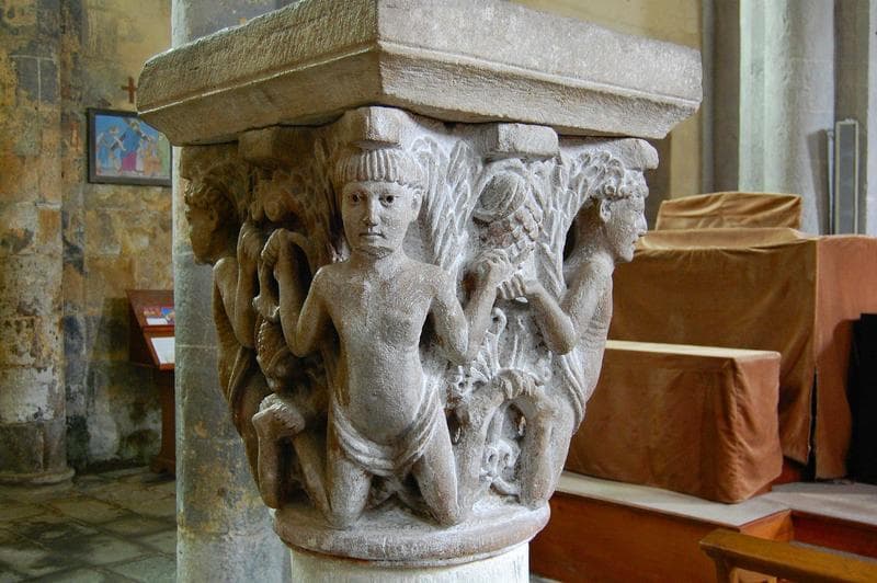 chapiteau : quatre personnages à genoux soutenant des grappes de raisin, vue générale