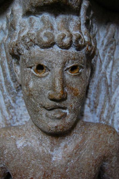 POP | Plateforme ouverte du patrimoinechapiteau : quatre personnages à genoux soutenant des grappes de raisin, détail