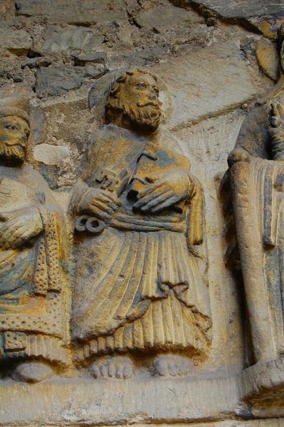 bas-relief : Vierge en majesté entre saint Pierre saint Jean saint Austremoine et des ecclésiastiques (la), détail de la partie de gauche