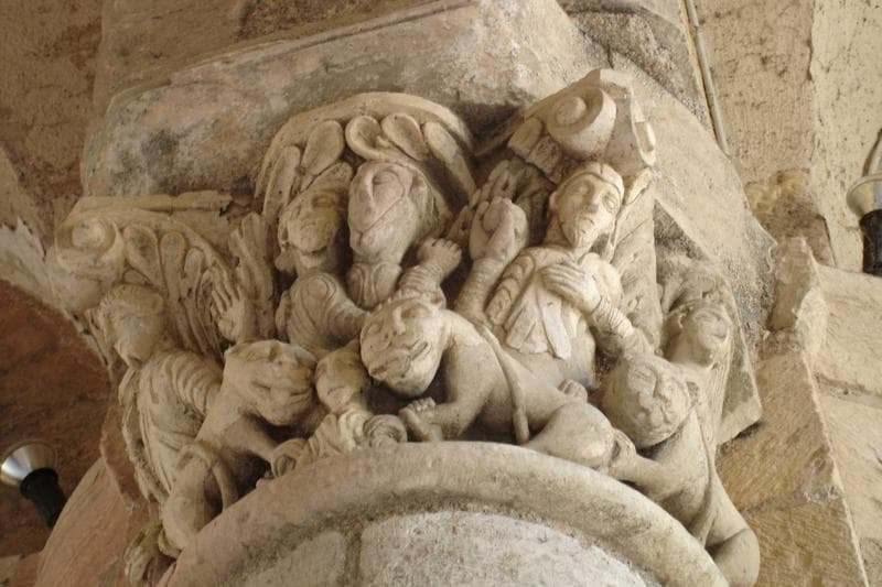 détail d'un des chapiteaux sculptés de la tour porche