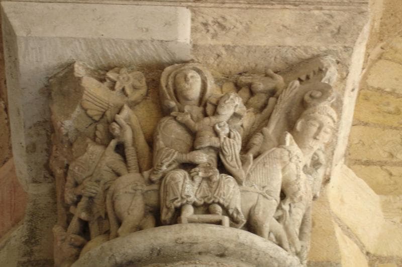 détail d'un des chapiteaux sculptés de la tour porche : la fuite en Egypte
