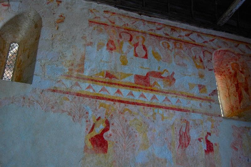 peintures murales, nef, mur Sud, vue partielle : la Cène, scène de martyre non identifiée