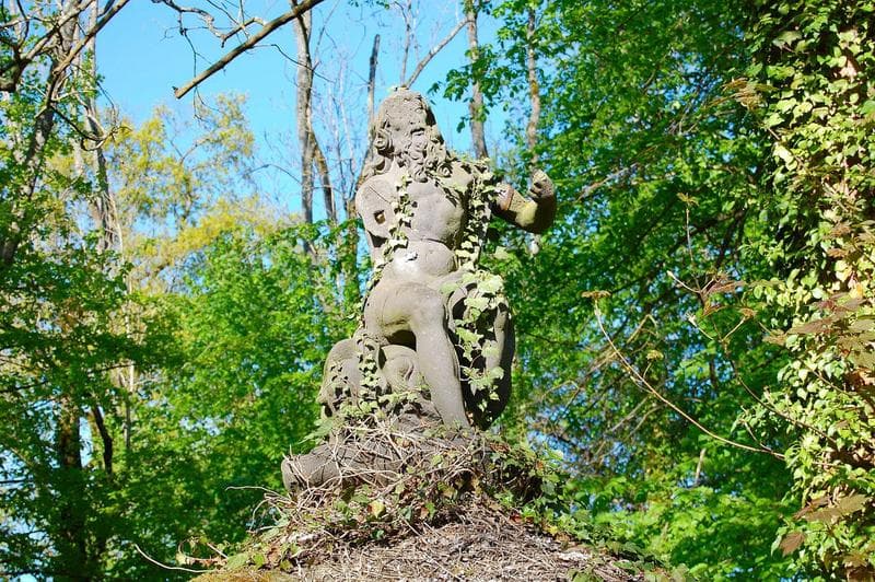 statue située au-dessus de la fabrique, homme barbu, vue générale