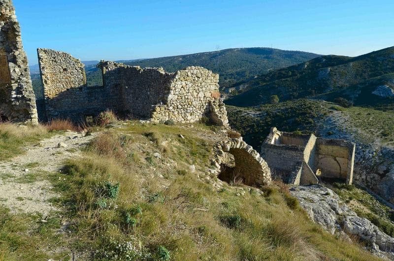 vue partielle des ruines, à l'arrière plan l'ancienne église de Roquemartine