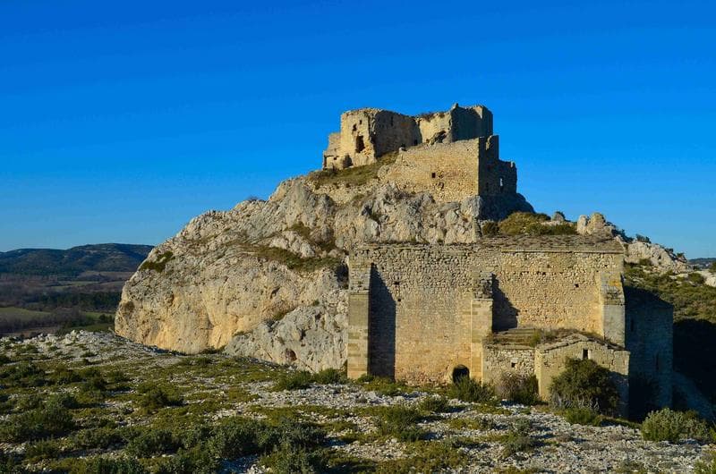vue générale du château dans son environnement, au premier plan l'ancienne église de Roquemartine