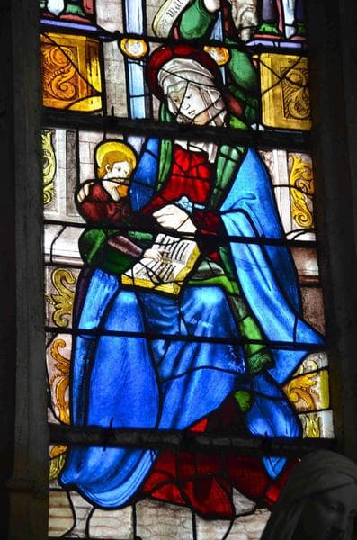 verrière des trois Marie, vue partielle, partie médiane de la lancette centrale, l'éducation de la Vierge