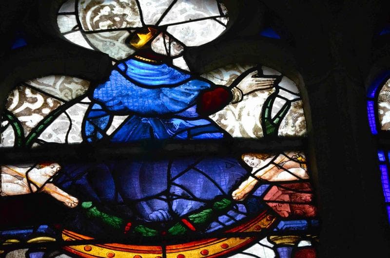 verrière des trois Marie, détail, partie supérieure de la lancette centrale, représentation du roi Joram