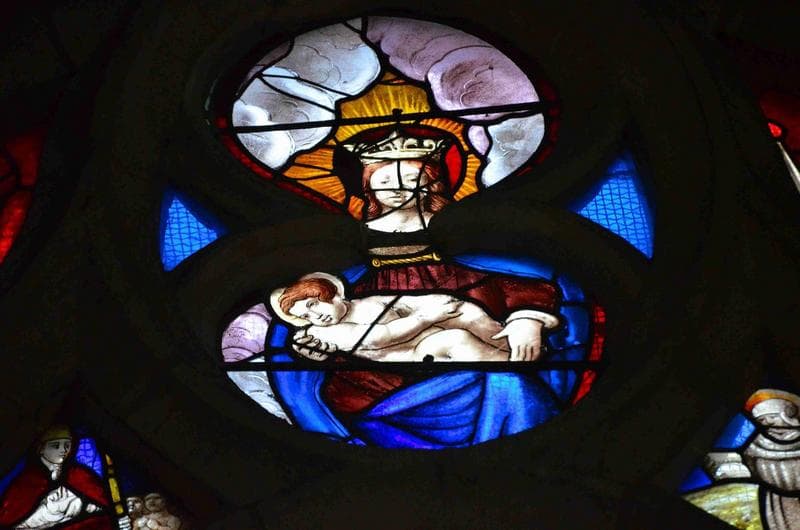verrière des trois Marie, détail, partie supérieure, Vierge à l'enfant