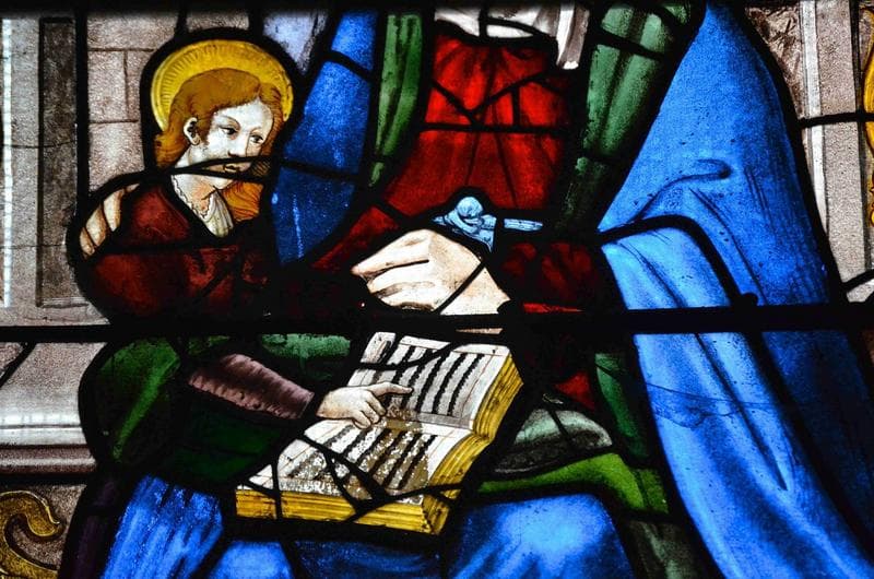 POP | Plateforme ouverte du patrimoineverrière des trois Marie, détail de la partie médiane de la lancette centrale, la Vierge Marie sur les genoux de sainte Anne