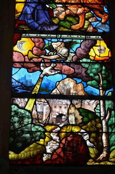 verrière de l'Apocalypse, mur Nord, vue partielle, partie inférieure de la lancette de gauche, représentation de l'aigle, le soleil, la lune et les étoiles sont noyés dans les ténébres