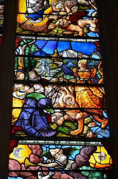 verrière de l'Apocalypse, mur Nord, vue partielle, partie médiane de la lancette de droite, représentation de la grande prostituée qui règne sur les rois de la terre