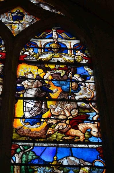 verrière de l'Apocalypse, mur Nord, vue partielle, partie supérieure de la lancette de droite, représentation d'une femme revêtue de soleil avec la lune sous ses pieds face à un dragon roux à sept têtes