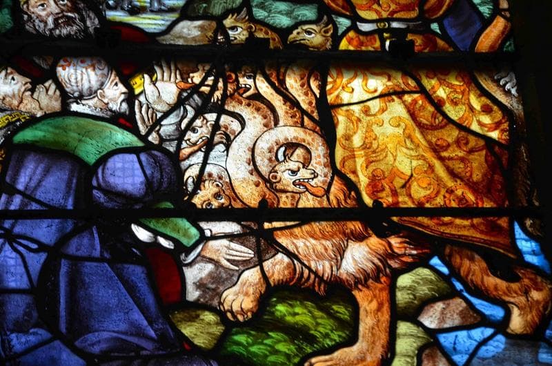 verrière de l'Apocalypse, mur Nord, détail, partie médiane de la lancette de droite, représentation de la monture de la grande prostituée qui règne sur les rois de la terre