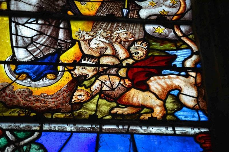 verrière de l'Apocalypse, mur Nord, détail, partie supérieure de la lancette de droite, représentation du dragon roux à sept têtes