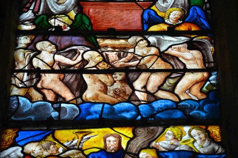verrière de l'Apocalypse, mur Nord, détail, partie supérieure de la lancette de gauche, représentation de la distribution par les anges des robes blanches blanchies dans le sang de l'Agneau