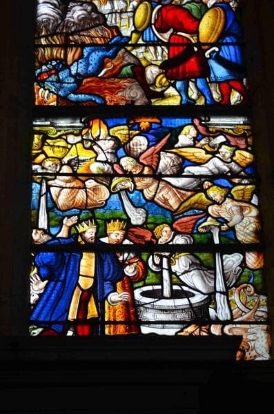 verrière de l'Apocalypse, mur Est, collatéral Nord, détail, partie inférieure de la lancette de droite, représentation des anges versant les fléaux de leur coupe sur la terre