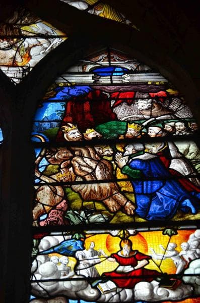 verrière de l'Apocalypse, mur Est, collatéral Nord, détail, partie médiane de la lancette de droite, représentation du diable jeté dans l'étang de feu