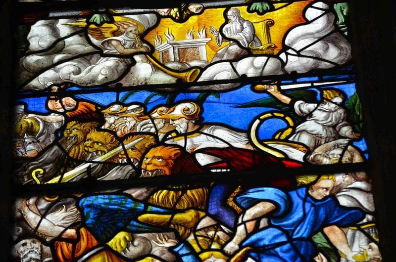 verrière de l'Apocalypse, mur Est, collatéral Nord, détail, partie supérieure de la lancette centrale, représentation de la montagne jetée dans la mer