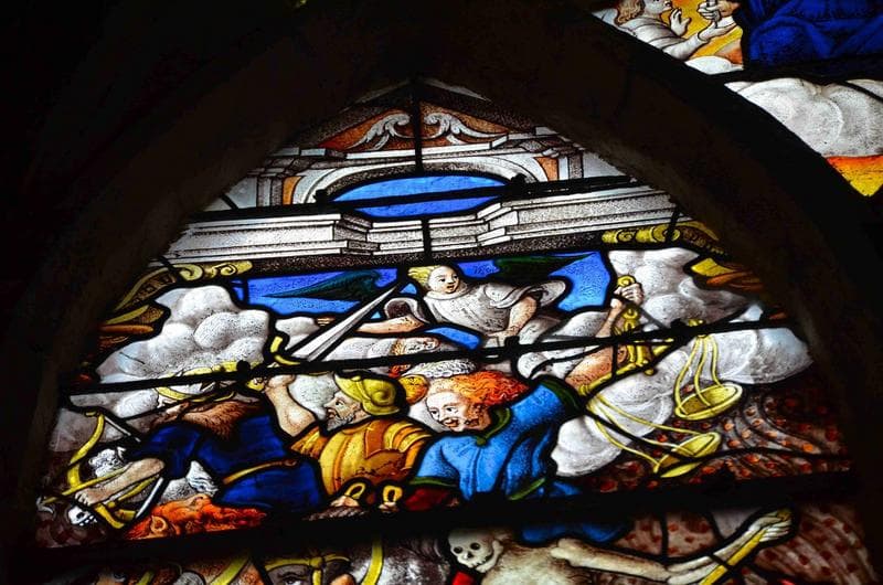 verrière de l'Apocalypse, mur Est, collatéral Nord, détail, partie supérieure de la lancette de gauche, représentation d'un des 4 chevaliers de l'Apocalypse