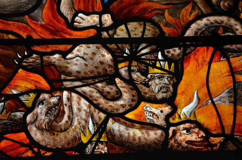 verrière de l'Apocalypse, mur Est, collatéral Nord, détail, partie médiane de la lancette de gauche, représentation d'un ange exterminateur