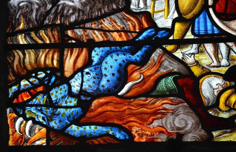 verrière de l'Apocalypse, mur Est, collatéral Nord, détail, partie inférieure de la lancette de droite, représentation des anges versant les fléaux de leur coupe sur la terre