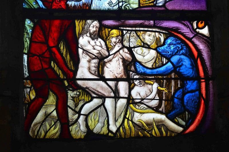 verrière du jugement dernier, détail, partie inférieure de la lancette de droite, les damnés