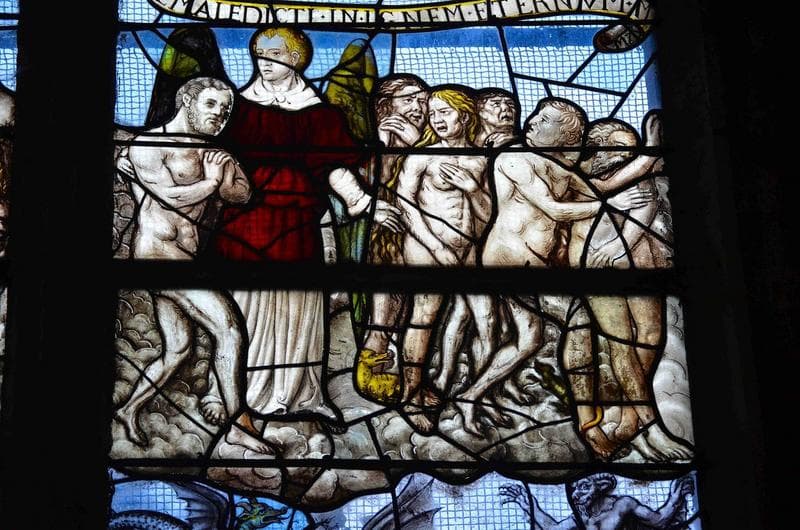 verrière du jugement dernier, détail, partie médiane de la lancette de droite, scène de la pesée des âmes