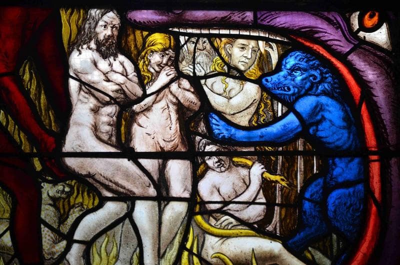 verrière du jugement dernier, détail, partie inférieure de la lancette de droite, les damnés