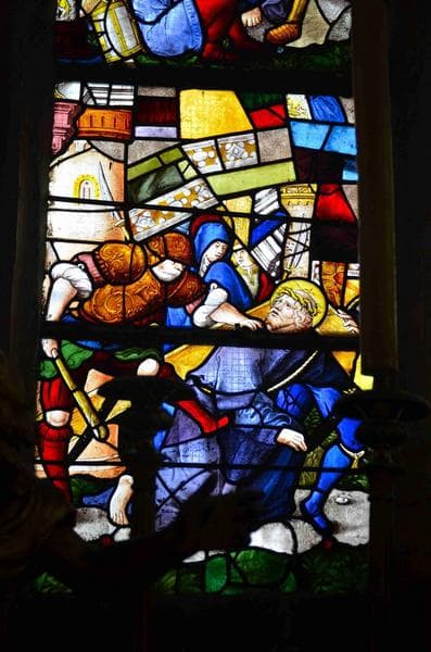 verrière des scènes de la Passion, vue partielle, partie inférieure de la lancette de gauche, le portement de croix