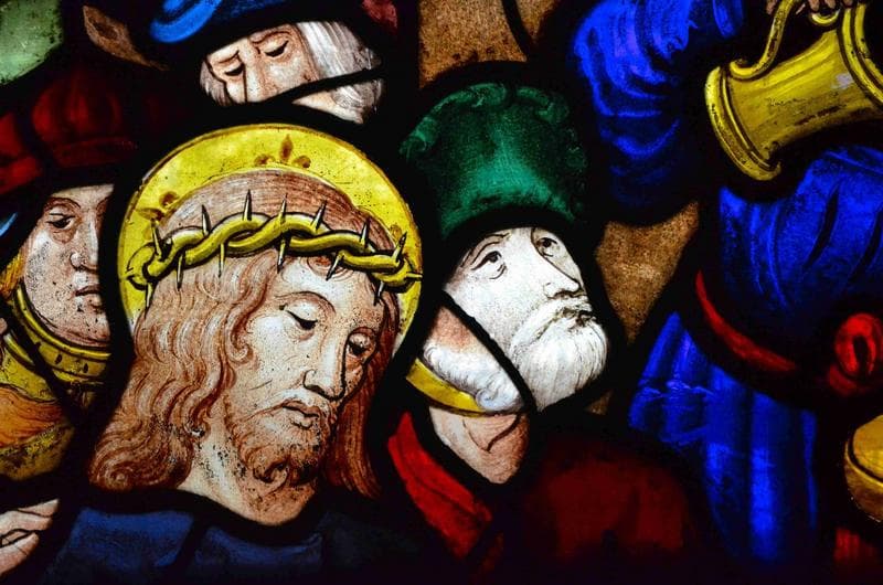 verrière des scènes de la Passion, détail, partie inférieure de la lancette de gauche, la Christ devant Pilate