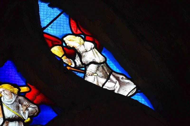 verrière des scènes de la Passion, détail, partie supérieure, ange portant un des instruments de la Passion