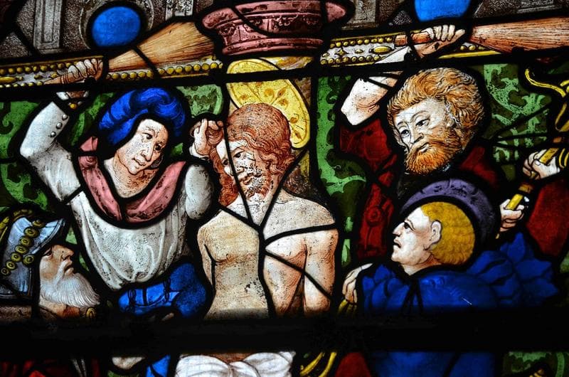 verrière des scènes de la Passion, détail, partie inférieure de la lancette médiane, la flagellation du Christ