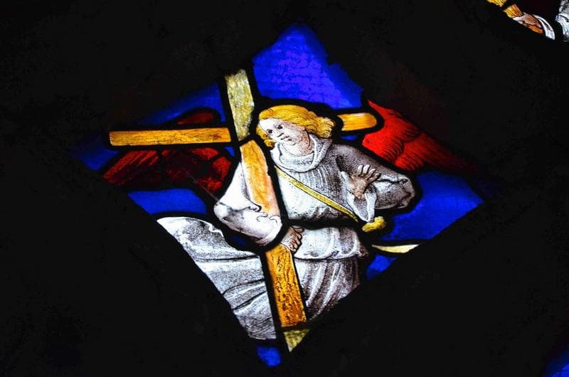 POP | Plateforme ouverte du patrimoineverrière des scènes de la Passion, détail, partie supérieure, ange portant la croix