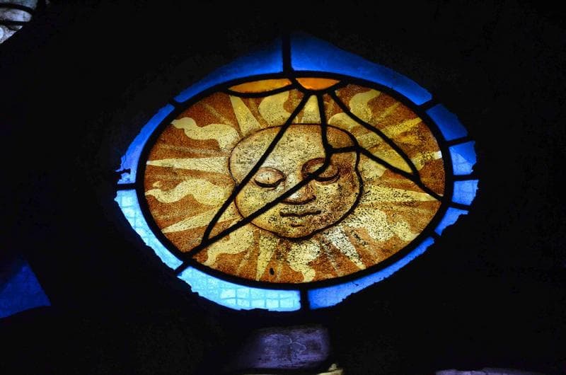 verrière des scènes de la Passion, détail, partie supérieure, soleil
