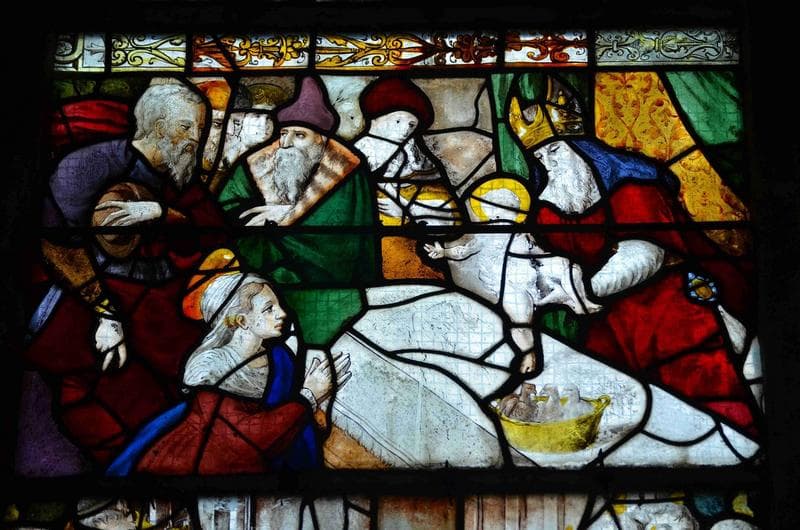 verrière : scènes de la vie de la Vierge, vue partielle, partie médiane de la lancette de gauche, épisode de la Circoncision