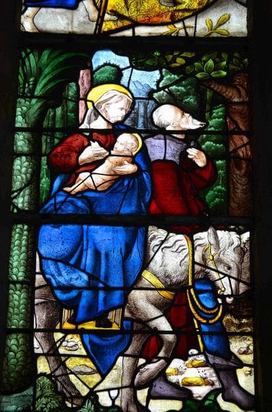 verrière : scènes de la vie du Christ, vue partielle, partie inférieure de la lancette de gauche, épisode de la fuite en Egypte