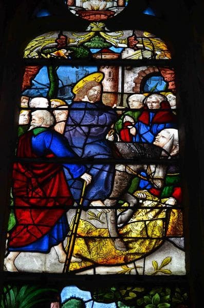 verrière : scènes de la vie du Christ, vue partielle, partie supérieure de la lancette de gauche, épisode de l'entrée du Christ à Jérusalem