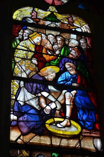 verrière : scènes de la vie du Christ, vue partielle, partie supérieure de la lancette de droite, épisode du lavement des pieds