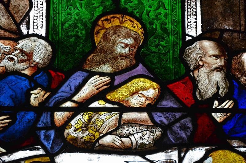verrière : scènes de la vie du Christ, détail, partie supérieure de la lancette médiane, représentation de la Cène : le Christ et saint Jean