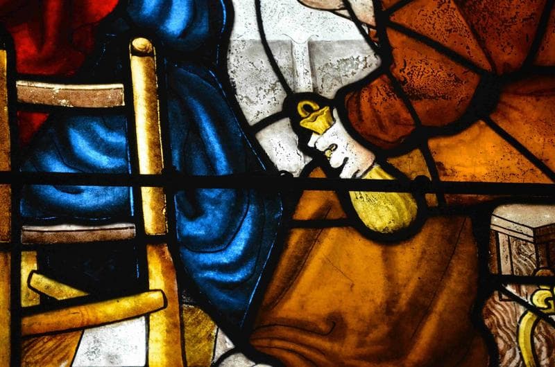 verrière : scènes de la vie du Christ, détail, partie supérieure de la lancette médiane, représentation de la Cène : la bourse de Judas