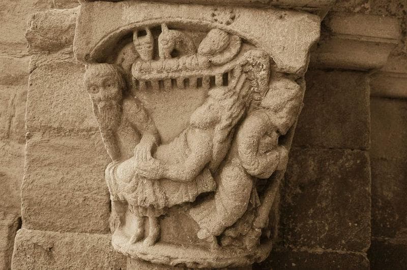 détail du chapiteau sculpté de la nativité, porche sud