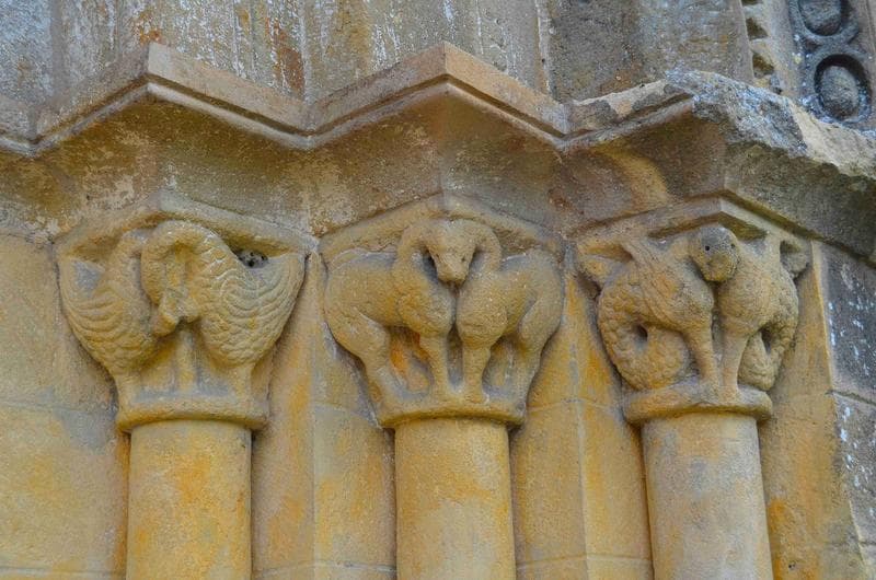 détail des chapiteaux sculptés situés à la droite du porche occidental