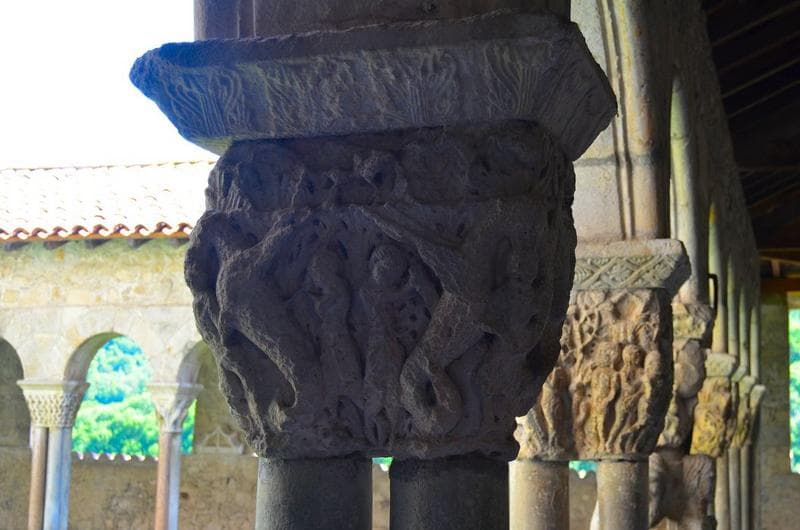 cloître, galerie ouest, détail d'un des chapiteaux jumelés sculptés
