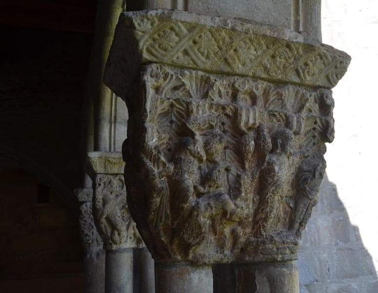 cloître, galerie ouest, détail d'un des chapiteaux jumelés sculptés