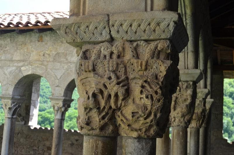 cloître, galerie ouest, détail d'un des chapiteaux jumelés sculptés