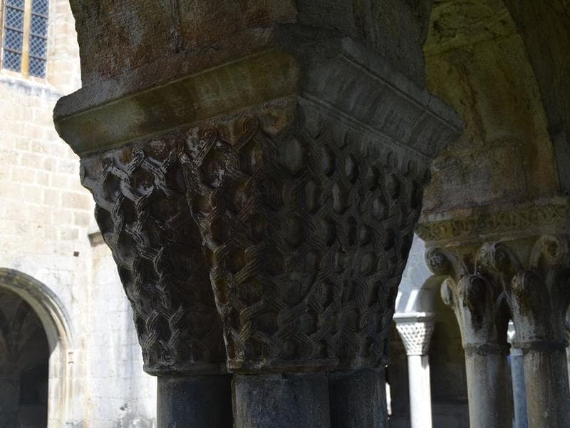 cloître, galerie sud, détail d'un des chapiteaux jumelés sculptés