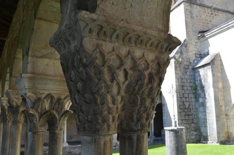 cloître, galerie sud, détail d'un des chapiteaux jumelés sculptés