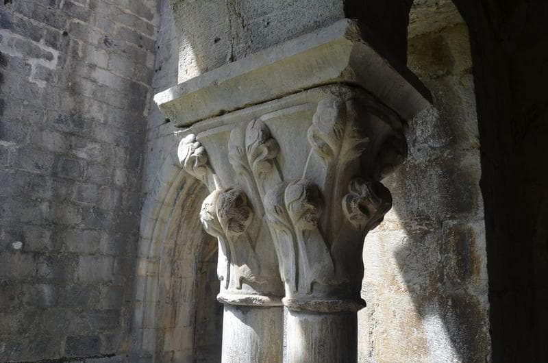 cloître, galerie est, détail d'un des chapiteaux jumelés sculptés