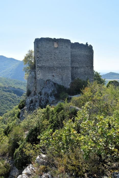 Château de Soyans : Vue générale des ruines du château dans leur environnement depuis le Nord-Est