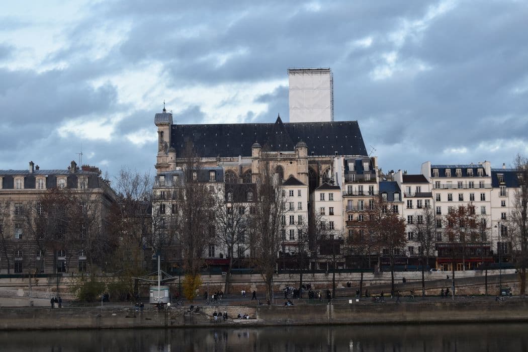 Eglise Saint-Gervais-Saint-Protais : Vue générale de l'église dans son environnement urbain depuis le quai aux Fleurs